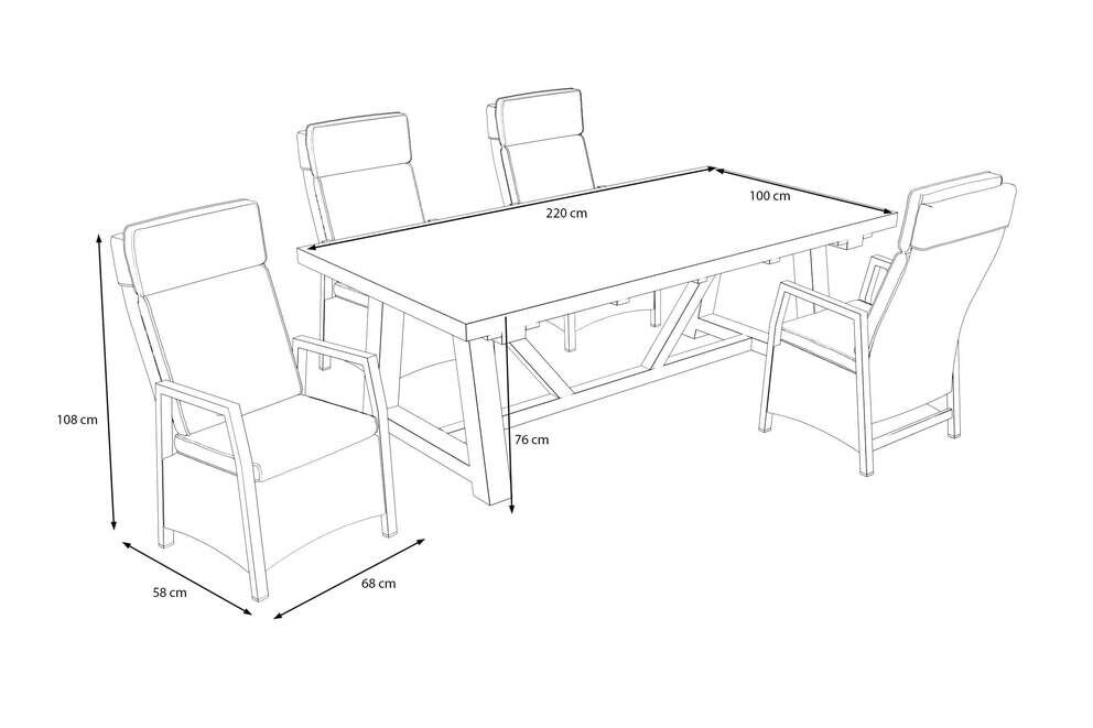 Erleben Sie stilvolle Geselligkeit im Freien mit der OUTFLEXX Nova Garten-Essgruppe. Diese exklusive Kombination aus einem großzügigen Esstisch aus recyceltem Teakholz und vier komfortablen Diningsesseln schafft den idealen Ort für entspannte Stunden im Garten oder auf der Terrasse. Das gelungene Zusammenspiel aus massivem Naturholz und modernen Materialien wie Aluminium und Polyrattan macht dieses Set zu einem echten Blickfang für jede Outdoor-Umgebung.