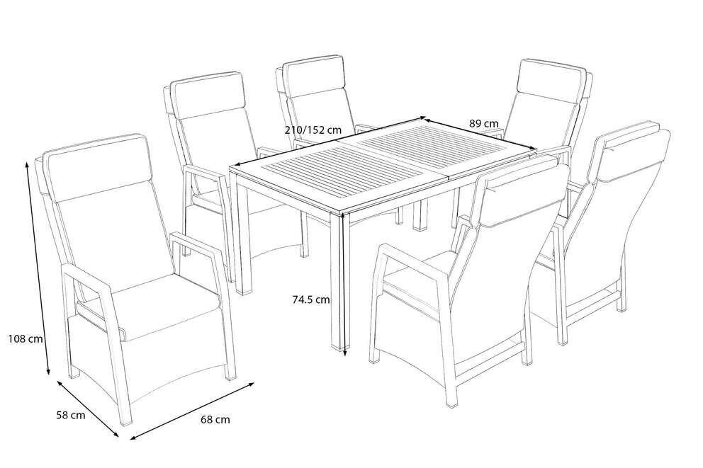 Die sechs ergonomischen Diningsessel mit ca. 68 cm Breite, ca. 58 cm Tiefe und ca. 108 cm Höhe bieten höchsten Sitzkomfort. Die hohe Rückenlehne ist verstellbar und ermöglicht entspanntes Sitzen – ideal für lange Sommerabende im Garten. |