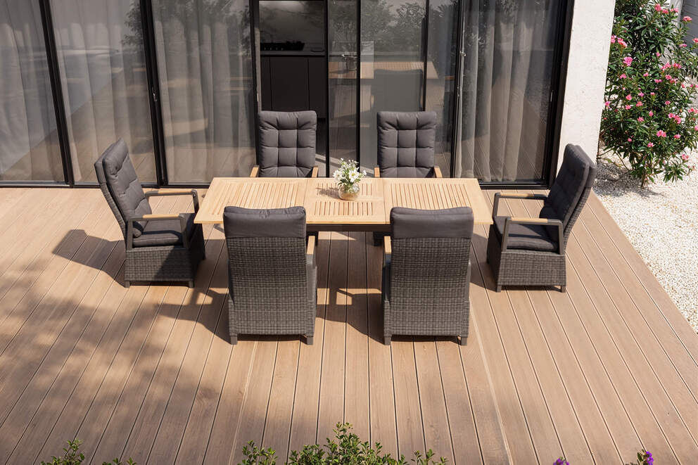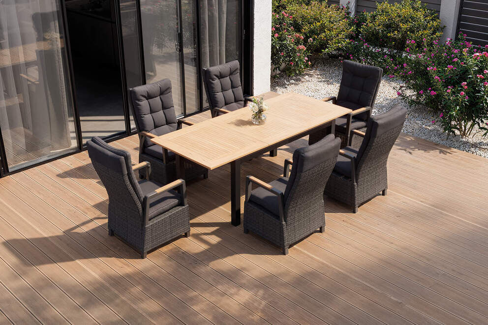 Das elegante Zusammenspiel aus anthrazitfarbenem Aluminium, grauem Polyrattan und natürlichem Teakholz sorgt für eine stilvolle Optik. Diese harmonische Farbkombination wertet jede Terrasse und jeden Garten auf und lässt sich vielseitig mit weiteren Möbeln kombinieren. |