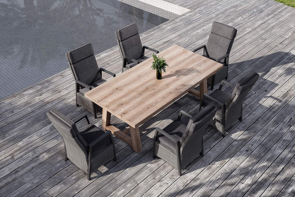 Diese Essgruppe überzeugt nicht nur durch ihre hochwertigen Materialien, sondern auch durch ihre ansprechende Farbkombination aus naturfarbenem Teakholz und modernem Anthrazit mit grauen Polstern. Der rustikale Charakter des Tisches harmoniert perfekt mit dem modernen Look der Sessel und macht die Gruppe zu einem echten Blickfang im Außenbereich.