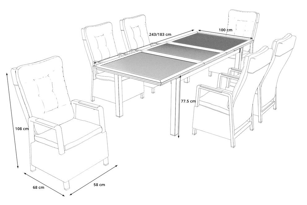 Die sechs Diningsessel sind mit einer mehrfach verstellbaren Rückenlehne ausgestattet, die per seitlichem Knopf bedient wird. Gemeinsam mit den weichen Sitzauflagen entsteht eine bequeme Sitzposition, die sowohl für lange Mahlzeiten als auch für entspannte Stunden im Freien ideal ist. |