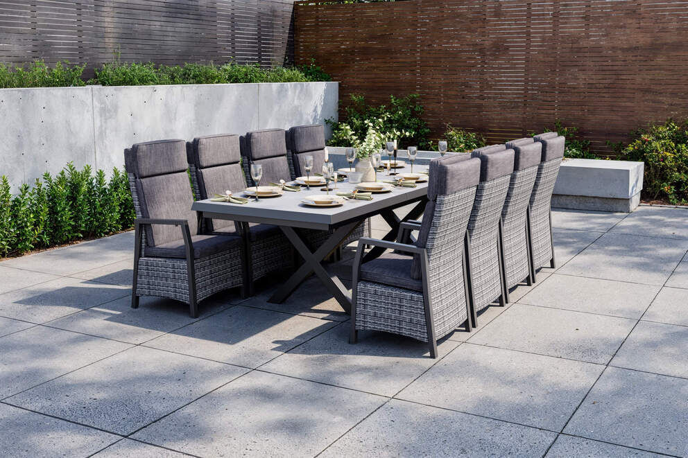 Die Kombination aus anthrazitfarbenem Aluminium, grauem Polyrattan und hochwertiger Steinimitatoberfläche verleiht Ihrem Außenbereich ein elegantes, stilvolles Gesamtbild. Das klare Design passt harmonisch in moderne wie klassische Gartenlandschaften. |