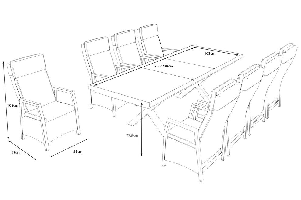 Die ergonomisch geformten Diningsessel mit hoher, verstellbarer Rückenlehne bieten ein besonders angenehmes Sitzgefühl. Dank der weichen ca. 220 g/m² Polster genießen Sie selbst lange Abende im Garten in bester Bequemlichkeit – ideal für entspannte Runden mit Familie und Freunden. |