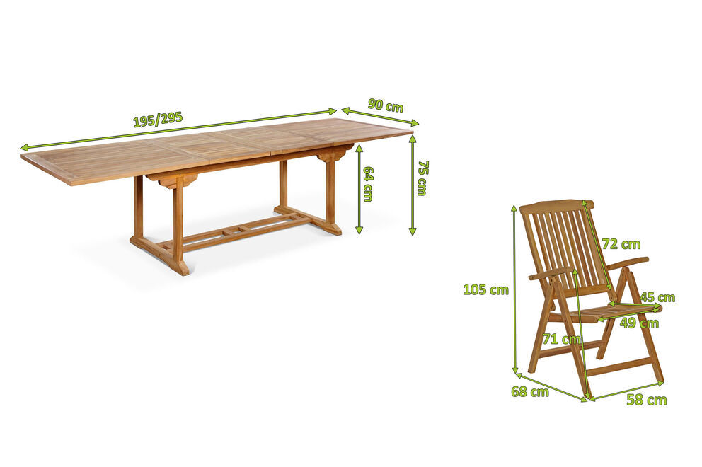 Ausgefallen, edel und robust zugleich präsentiert sich diese Design-Sitzgruppe aus dem Hause OUTFLEXX®. Das Set besteht aus einem schönen Ausziehtisch mit den Maßen von ca. 195/295 x 90 x 75 cm und 8 bequemen Klappsesseln mit den Maßen von ca. 58 x 68 x 105 cm mit einer Sitzhöhe von ca. 46 cm und einer Sitztiefe von ca. 45 cm.
