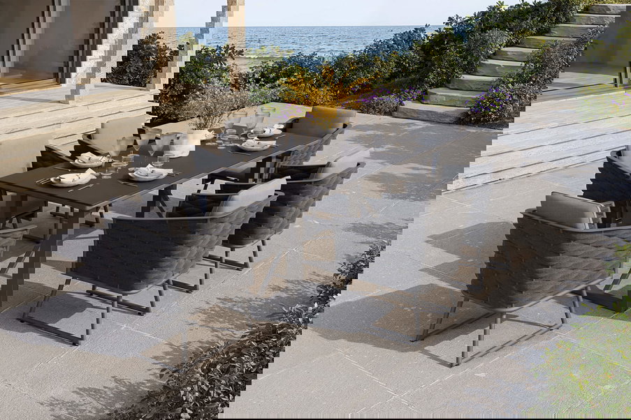 Die Esstischgruppe Oranger Blossom von OUTFLEXX® zeichnet sich gleichermaßen durch ihr edles Design, sowie durch extrem robuste und pflegeleichte Materialien und deren hochwertiger Verarbeitung aus.