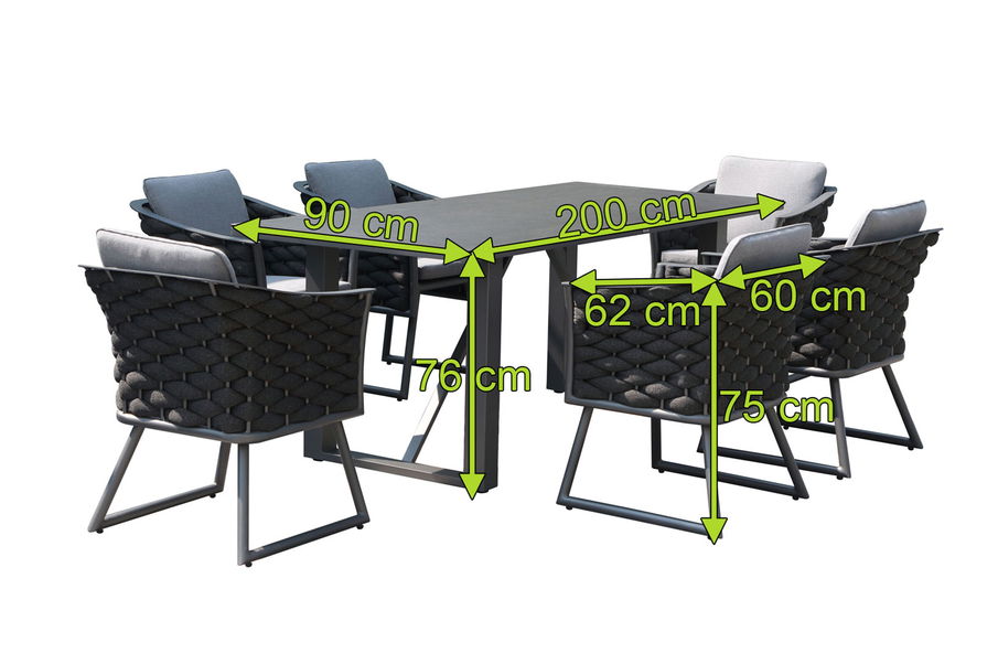 Das Set besteht insgesamt aus einem Esstisch und sechs hochwertigen Stühlen. Der Tisch ist 200 cm lang und 90 cm breit und bietet somit genügend Platz für einen schönen Grillabend mit Freunden oder der Familie. Der Tisch wiegt ca. 47,5 kg und die Tischplatte ist aus Keramikglass hergestellt worden. Die Tischplatte ist ca. 2,5 cm dick. Das hochwertige Aluminiumgestell wurde sowohl bei dem Tisch als auch bei den Stühlen pulverbeschichtet und kommt in einem eleganten Anthrazit daher. Die Pulverbeschichtung sorgt für längere Haltbarkeit, sodass Sie lange etwas von dieser Esstischgruppe haben. Die bequemen Stühle haben ebenfalls ein Gestell aus Aluminium und die Sitz- und Rückenfläche ist bespannt mit sehr dickem XL Rope Gewebe ( ca. 3 x 4 cm dick ). Mit den Maßen von ca. 60 x 62 x 75 cm und einem Gewicht von ca. 8,89 kg bietet dieser Stuhl genügend Platz um es sich so richtig gemütlich zu machen.
