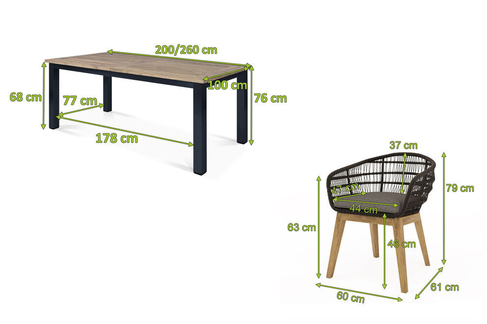 Ausgefallen, edel und robust zugleich präsentiert sich diese Design-Sitzgruppe aus dem Hause OUTFLEXX®. Das Set besteht aus einem schönen Esstisch mit den Maßen von ca. 200/260 x 100 x 76 cm und 6 bequemen Sesseln mit den Maßen von ca. 60 x 61 x 79 cm cm mit einer Sitzhöhe von ca. 46 cm und einer Sitztiefe von ca. 47 cm.