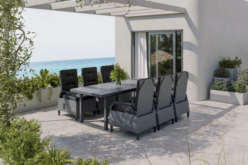 Ergänzt wird der Tisch durch sechs stilvolle Dining-Sessel mit verstellbarer Rückenlehne. Die komfortablen Sessel bestehen aus robustem, wetterfestem Polyrattan in anthrazit/grau und überzeugen mit ergonomischer Form und hochwertiger Verarbeitung. Für besonderen Sitzkomfort sorgen die im Lieferumfang enthaltenen UV-beständigen Polster in passender Farbgebung. Mit einer Höhe von ca. 111 cm, einer Tiefe von ca. 68 cm und einer Breite von ca. 60 cm bieten die Sessel großzügige Sitzflächen und lassen sich dank ihres geringen Gewichts von ca. 10,2 kg flexibel umstellen.