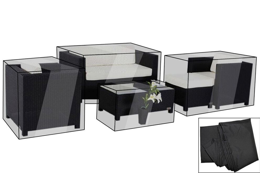 Dieses 4-teilige OUTFLEXX® Premium Abdeckhauben-Set in Schwarz besteht aus 100% Polyester mit einer Stärke von ca. 170g/m². Sie ist mit einer PU-Beschichtung versehen, die sie wasserbeständig und uv-stabil macht. Damit schützen Sie Ihre wertvolle Polyrattan Loungegarnitur zuverlässig vor Staub und Verschmutzung. Die Schutzhülle ist mit einem stabilen Zugband versehen und lässt sich so fest verzurren.