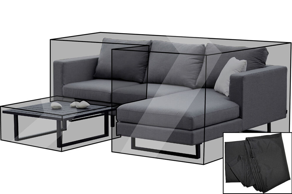 Das Set besteht aus 2 Hauben, eine in L-Form für eine Ecklounge und eine für einen Loungetisch und hat folgende Maße: