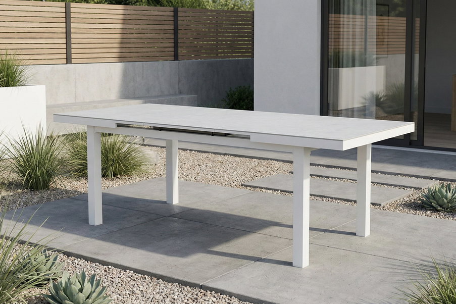Der Ausziehtisch besteht aus robustem Aluminium und einer Tischplatte aus edlem Glas, die nicht nur optisch überzeugt, sondern auch leicht zu reinigen ist. Dank der Pulverbeschichtung ist das Gestell korrosionsbeständig und hält selbst anspruchsvollen Witterungsbedingungen stand. Die glatte, pflegeleichte Oberfläche sorgt dafür, dass der Tisch immer in perfektem Zustand bleibt – egal, ob nach einem Sommerregen oder einem gemütlichen Familienessen im Freien.