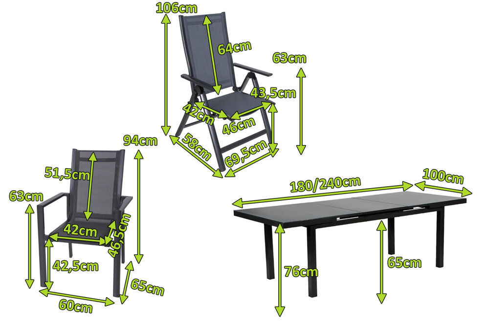 In den schicken Sitzmöbeln lässt es sich herrlich Entschleunigen - nehmen Sie Platz! Dank der bequemen Sitz- und Rückenfläche erhalten Sie einen angenehmen Sitzkomfort, der Sie und Ihre Lieben begeistern wird. Die Maße der Klappstühle liegen bei ca. 69,5 x 58 x 106 cm und die Maße der Stapelsessel bei ca. 65 x 60 x 94 cm und mit dem geringen Gewicht von ca. 9 kg bzw. 3,3 kg können Sie die Sitzmöbel auch schnell an Ihren Lieblingsplätzen im Garten, auf der Terrasse oder dem Balkon platzieren. Dank der hochwertigen Materialien und erstklassigen Verarbeitung sind die Sessel bis zu ca. 120 kg belastbar. Ihr Komfort steht jedoch an erster Stelle! Die großzügige Rückenlehne der Klappstühle lässt sich ganz leicht 7-fach verstellen und ermöglicht Ihnen somit ein individuelles Sitzgefühl und vollste Entschleunigung. So können Sie spielend von einer Liege- in eine Sitzposition und wieder zurück wechseln, ganz nach Bedarf. Diese Flexibilität gepaart mit dem gehobenen Sitzgenuss machen den leichten Klappsessel zum perfekten Begleiter. Für das schicke und solide Gestell der Sessel kommt korrosionsbeständiges Aluminium mit Pulverbeschichtung in anthrazit zum Einsatz. Bespannt werden sie mit dem hochwertigen Outdoorgewebe Textilene im passenden Grauton. Das luftige Gewebe sorgt für ein herrlich leichtes Sitzgefühl, das seinesgleichen sucht. Die Sitz- und Rückenfläche ist UV-beständig und verliert nie ihre Form. Das Material trocknet auch so schnell, dass Sie sich nach einem kurzen Regenschauer rasch wieder hinsetzen können. Erhöhten Komfort bieten die schlichten und zugleich markanten Armlehnen aus Aluminium, die auch optisch überzeugen. Mit Hilfe der Stapel- bzw. Klappfunktion lassen sich die Sessel auch einfach platzsparend verstauen.