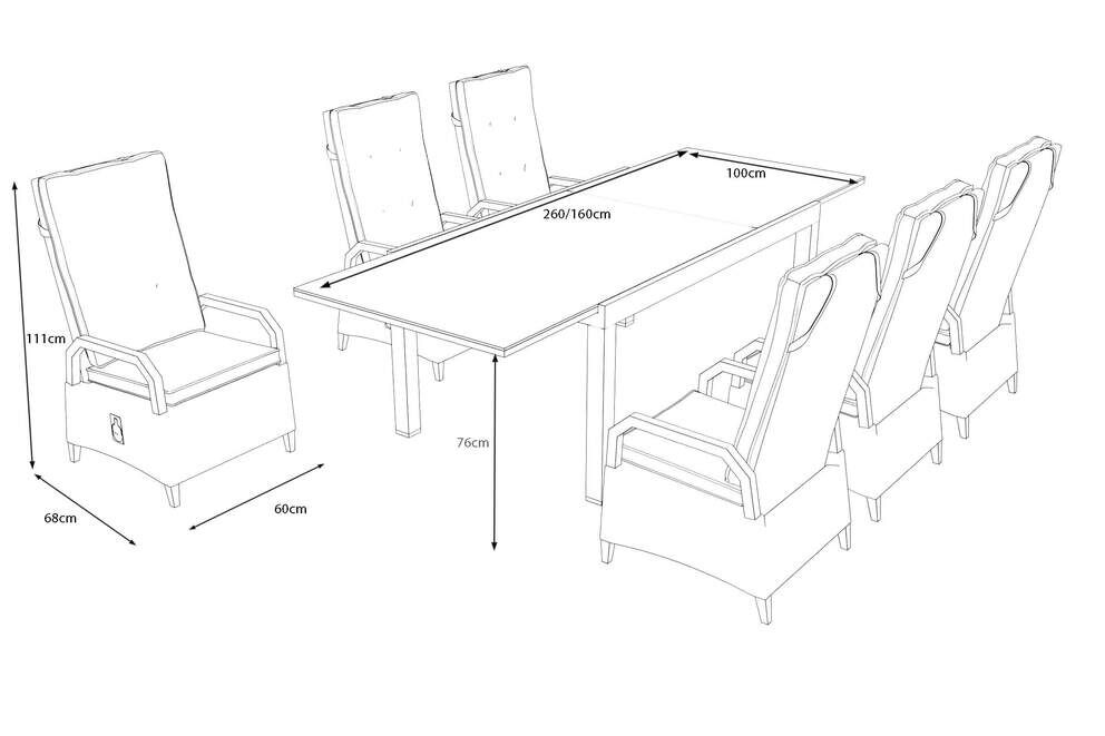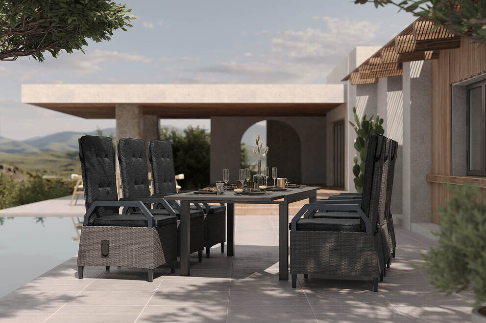 Ergänzt wird der Tisch durch sechs formschöne Dining-Sessel, die mit ihrer modernen Linienführung und der komfortablen Polsterung begeistern. Das wetterfeste Polyrattangeflecht in Grau-Anthrazit überzeugt durch seine elegante Struktur und besondere Strapazierfähigkeit. Die ca. 111 cm hohe Rückenlehne bietet hervorragenden Sitzkomfort und lässt sich per seitlichem Hebel angenehm verstellen – perfekt, um das Essen entspannt ausklingen zu lassen. Dicke, UV-beständige Sitz- und Rückenpolster mit Fixierbändern sorgen dafür, dass alles an Ort und Stelle bleibt und Sie jederzeit bequem sitzen.