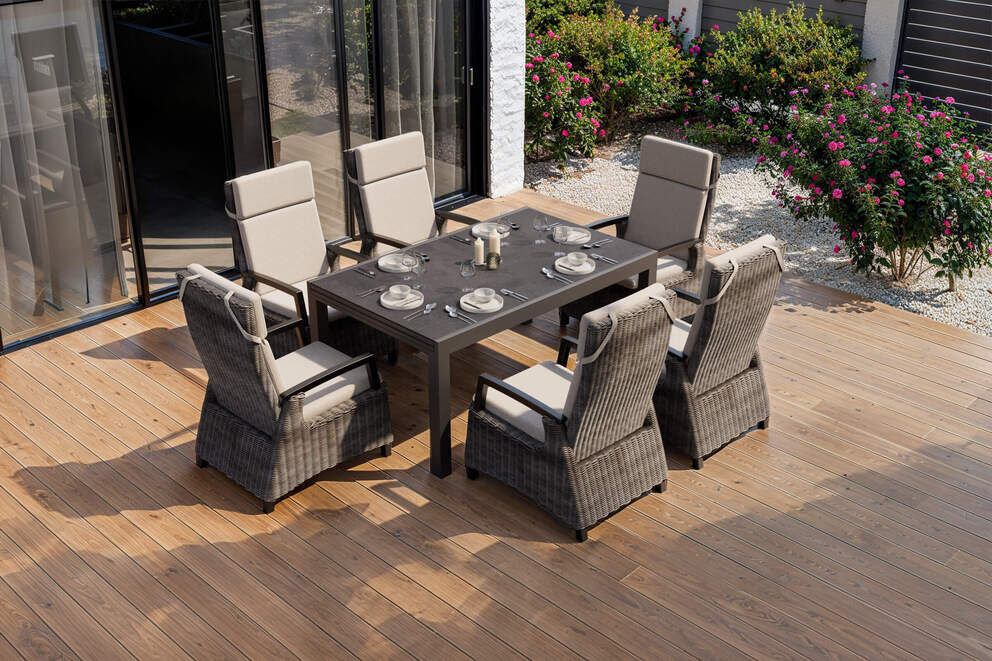 Die sechs SIENA GARDEN Corido Dining Move Sessel ergänzen den Tisch perfekt. Ihr pulverbeschichtetes Aluminiumgestell in anthrazit harmoniert optimal mit dem halbrunden Gardino®-Polyrattangeflecht in charcoal grey. Das Geflecht ist wetterfest, UV-beständig, formstabil und schmutzunempfindlich – genau das Richtige für langlebige Möbel im Außenbereich. Die großzügige Rückenlehne ist per Hydrauliksystem stufenlos verstellbar und ermöglicht ein besonders angenehmes Sitzgefühl – ob aufrecht beim Essen oder zurückgelehnt zum Entspannen. Die weichen Sitz- und Rückenkissen in taupe meliert bestehen aus robustem Polypropylen (ca. 280 g/m²), verfügen über einen Reißverschluss und können per Handwäsche gereinigt werden.
