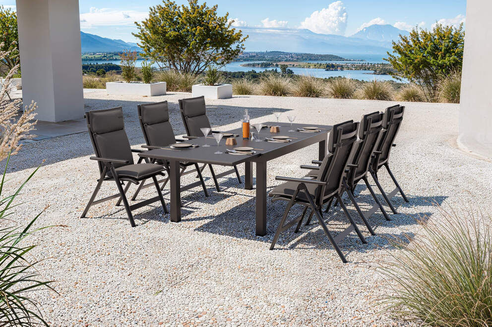 Erleben Sie stilvolle Momente im Freien mit der exklusiven OUTFLEXX Premium Garten-Essgruppe – einer Kombination aus hochwertigem Aluminium, komfortablen Hochlehner-Stühlen und einem großzügigen Ausziehtisch. Diese moderne Essgruppe verbindet elegantes Design mit durchdachter Funktionalität und schafft einen Ort, an dem Sie mit Familie und Freunden entspannte Stunden genießen können.