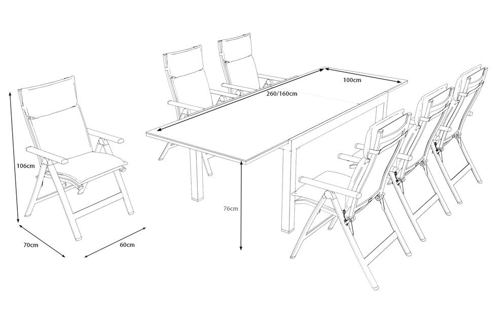 Die sechs im Set enthaltenen Hochlehner-Klappstühle aus Aluminium und luftdurchlässigem Textilene sorgen für erstklassigen Sitzkomfort. Die Rückenlehnen lassen sich 7-fach verstellen und ermöglichen eine ergonomische Sitzposition, egal ob beim Essen oder beim Zurücklehnen und Entspannen. Mit einem Gewicht von nur ca. 5 kg pro Stuhl sind sie angenehm leicht und dennoch belastbar bis ca. 130 kg. Durch die klappbare Konstruktion lassen sie sich bei Bedarf platzsparend verstauen.