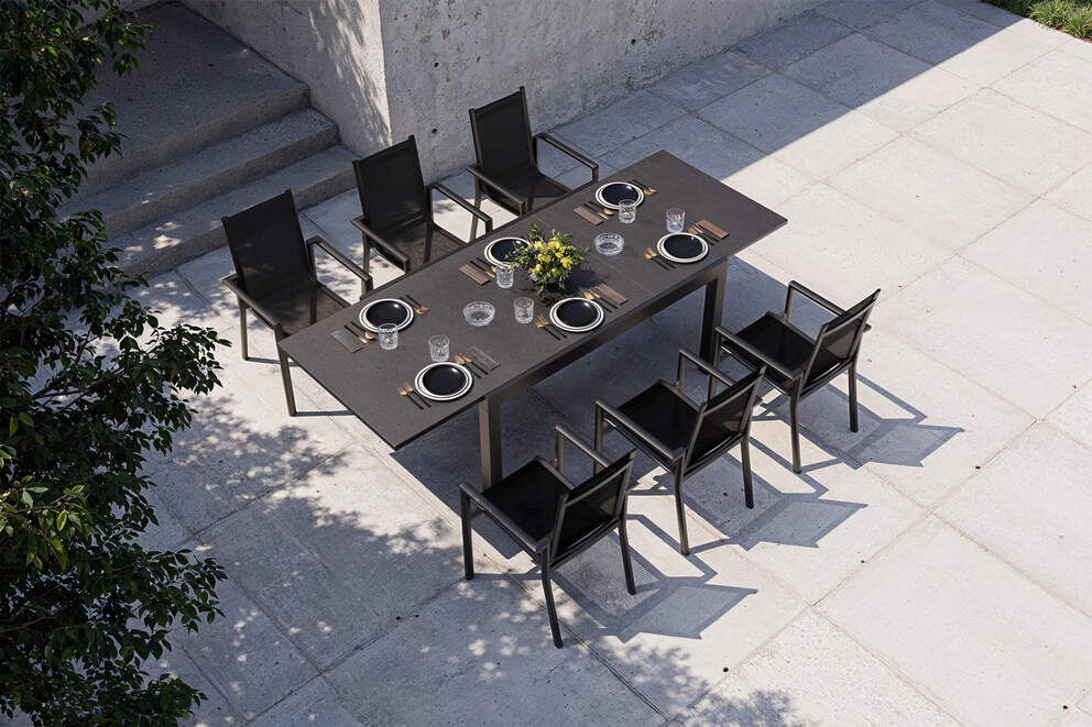 Die gesamte Essgruppe ist für den dauerhaften Einsatz im Freien konzipiert. Aluminium und Textilene gelten als besonders pflegeleicht und witterungsbeständig, wodurch die Gartenmöbel spielend leicht Wind und Wetter standhalten. Auch die Spraystone-Tischplatte ist resistent gegen äußere Einflüsse, sodass sie ihre hochwertige Optik langfristig beibehält. Die Materialien sind farbstabil, leicht zu reinigen und ideal für einen unkomplizierten Alltag im Outdoorbereich geeignet.