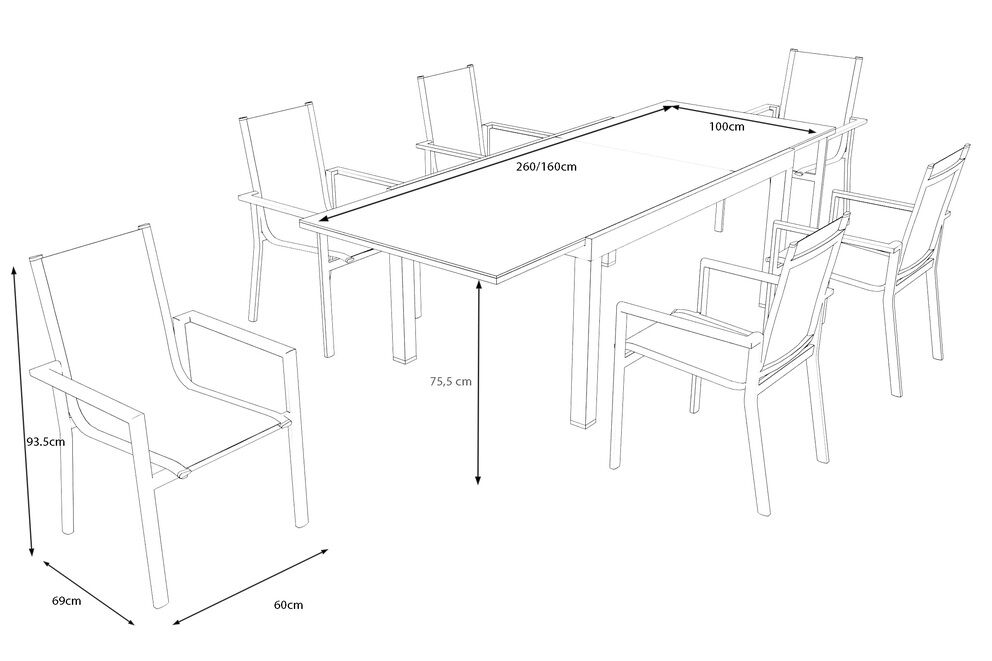 Ergänzt wird der Tisch durch sechs komfortable Stapelsessel aus pulverbeschichtetem Aluminium mit luftdurchlässiger Textilene-Bespannung in schwarz. Das Material schmiegt sich angenehm dem Körper an und bleibt auch bei warmen Temperaturen atmungsaktiv. Dank ihres geringen Gewichts von ca. 3,2 kg pro Stuhl lassen sich die Sessel leicht bewegen, umstellen und platzsparend stapeln. Mit einer Belastbarkeit von ca. 130 kg und ihren ergonomisch geformten Armlehnen bieten sie eine überzeugende Mischung aus Komfort und Stabilität. Die Sitzfläche von ca. 42,5 x 46,5 cm und die angenehme Sitzhöhe von ca. 44 cm sorgen für entspanntes Sitzen über längere Zeiträume.