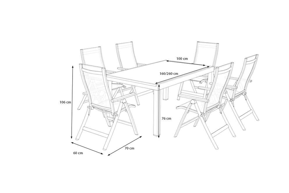 Passend zum Tisch umfasst das Set sechs komfortable Klappstühle mit einer Gesamtgröße von ca. 60 x 70 x 106 cm. Das anthrazit matte Aluminiumgestell kombiniert Robustheit mit geringem Gewicht, sodass die Stühle leicht bewegt werden können. Der schwarze Textilene-Bezug ist luftdurchlässig, strapazierfähig und bietet selbst an warmen Tagen ein angenehmes Sitzgefühl. Die Rückenlehnen lassen sich 7-fach verstellen und ermöglichen damit individuelle Sitzpositionen – vom aufrechten Sitzen bis zur entspannten Zurücklehn-Haltung. Mit einer Belastbarkeit von ca. 130 kg und einer ergonomischen Kontur erfüllen die Stühle hohe Anforderungen an Komfort und Stabilität.