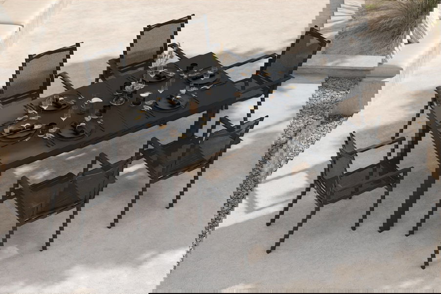 Bei dieser Premium Esstischgruppe treffen hochwertige Materialien und Design auf modernste Weise aufeinander. Das Set besteht aus einem innovativen Premium Ausziehtisch mit den Maßen von ca. 180/240 x 100 x 76 cm und 6 Stapelsesseln in der Farbe 'OUTFLEXX® Anthrazit Matt'.