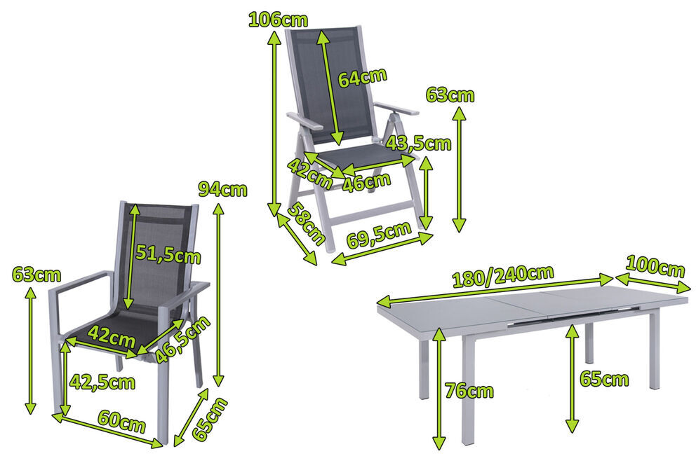 Genießen Sie die charmante Tischgruppe und verbringen Sie schöne Momente im Kreise Ihrer Lieben auf der Terrasse oder im Garten. In den Sitzmöbeln lässt es sich herrlich Entschleunigen und sie bestechen durch ihren modernen Look. Dank der bequemen Sitz- und Rückenfläche erhalten Sie einen angenehmen Sitzkomfort, der Sie und Ihre Lieben begeistern wird. Die Maße der Klappstühle liegen bei ca. 69,5 x 58 x 106 cm und die Maße der Stapelsessel bei ca. 65 x 60 x 94 cm und mit dem geringen Gewicht von ca. 9 kg bzw. 3,3 kg können Sie die Sitzmöbel auch schnell an Ihren Lieblingsplätzen im Garten, auf der Terrasse oder dem Balkon platzieren. Dank der hochwertigen Materialien und erstklassigen Verarbeitung sind die Sessel bis zu ca. 120 kg belastbar. Ihr Komfort steht jedoch an erster Stelle! Die großzügige Rückenlehne der Klappstühle lässt sich ganz leicht 7-fach verstellen und ermöglicht Ihnen somit ein individuelles Sitzgefühl und vollste Entschleunigung. So können Sie spielend von einer Liege- in eine Sitzposition und wieder zurück wechseln, ganz nach Bedarf. Diese Flexibilität gepaart mit dem gehobenen Sitzgenuss machen den leichten Klappsessel zum perfekten Begleiter. Für das schicke und solide Gestell der Sessel kommt korrosionsbeständiges Aluminium mit Pulverbeschichtung im glanzvollen Silberton zum Einsatz. Bespannt werden sie mit dem hochwertigen Outdoorgewebe Textilene im passenden Grauton. Das luftige Gewebe sorgt für ein herrlich leichtes Sitzgefühl, das seinesgleichen sucht. Die Sitz- und Rückenfläche ist UV-beständig und verliert nie ihre Form. Das Material trocknet auch so schnell, dass Sie sich nach einem kurzen Regenschauer rasch wieder hinsetzen können. Erhöhten Komfort bieten die schlichten und zugleich markanten Armlehnen aus Aluminium, die auch optisch überzeugen. Mit Hilfe der Stapel- bzw. Klappfunktion lassen sich die Sessel auch einfach platzsparend verstauen.