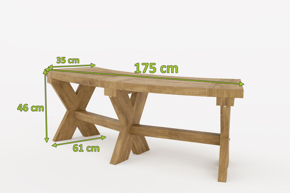Diese elegante Sitzbank hat eine Größe von ca. 175 x 61 x 46 cm und bietet bis zu 3 Personen einen bequemen Sitzplatz. Durch das Gestell aus gebürstetem recycled FSC®-Teakholz ist diese Bank nicht nur langlebig und robust, sondern auch umweltschonend. Die FSC®-/SLVK Zertifizierung stellt sicher, dass das Teakholz aus verantwortungsvollen Quellen stammt und Sie sich mit gutem Gewissen zurücklehnen können. Das wiederverwertete Teakholz verleiht der Quantum Bank einen ganz besonderen Charme, jedes Möbelstück ist so einzigartig wie die Geschichte des verwendeten Holzes. Auch die Maserung ist individuell, so dass jede Bank ein wahres Einzelstück ist. Die gebürstete Oberfläche sorgt dafür, dass die natürliche Struktur des Holzes erhalten bleibt und die Maserung besonders gut zur Geltung kommt. Teakholz besitzt generell eine hohe Haltbarkeit und Witterungsbeständigkeit. Durch den hohen Anteil holzeigener Öle ist es extrem wasserabweisend und hat einen natürlichen Schutz gegen Pilze und andere Schädlinge. Wir empfehlen Teak Möbel einmal pro Jahr zu reinigen. Am besten können Sie die Möbel mithilfe von einer milden Seifenlauge oder Teak Reiniger und einer Bürste von Schmutz befreien. Spülen sie die Möbel anschließend mit ausreichend Wasser ab und lassen Sie das Holz gut trocknen und auslüften. Sollten sich auf dem Holz extrem starke Verschmutzungen zeigen, können Sie diese vorsichtig abschleifen. Dafür empfiehlt es sich ein sehr feinkörniges Schleifpapier zu verwenden.