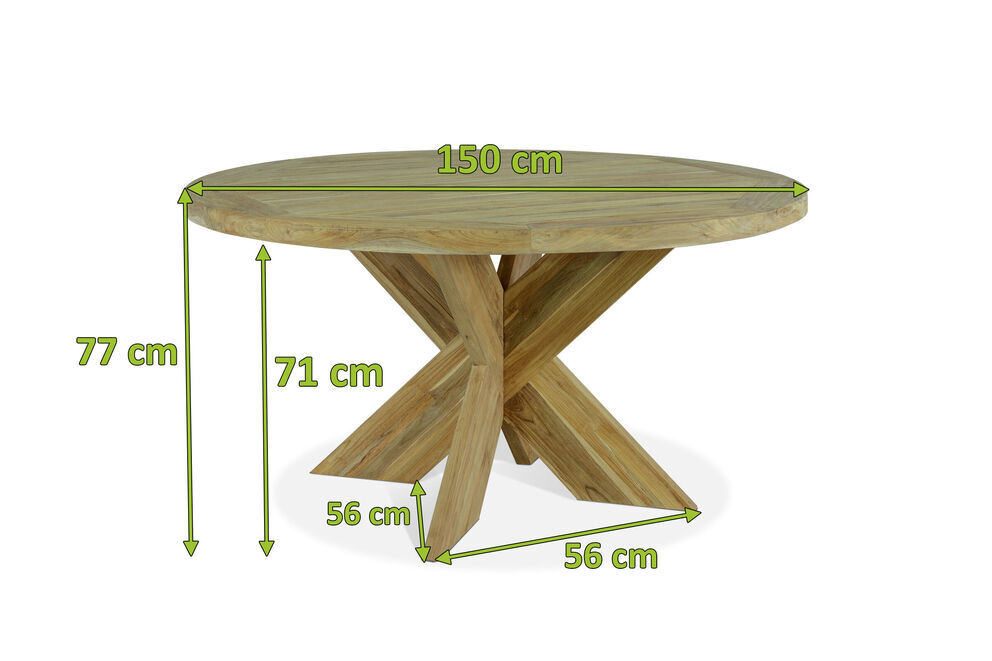 Mit den Maßen von ca. Ø150 x 77 cm bietet er ausreichend Platz für Freunde und Familie. Die Stärke der Tischplatte von ca. 5 cm und die stabilen Beine unterstreichen das rustikale Design zusätzlich. Das verwendete Teakholz und dessen hochwertige Verarbeitung macht den Tisch besonders strapazierfähig und robust, und mit einem Gewicht von ca. 24 kg zusätzlich sehr stabil aber auch leicht bewegbar. Das Teakholz ist besonders witterungsbeständig und hält sowohl Hitze und Frost, als auch Regen und Feuchtigkeit aus. Es hat außerdem aufgrund des hohen Anteils an holzeigenen Ölen einen natürlichen Schutz gegen Pilze und andere Schädlinge, sodass sich die Pflege dieses Gartentisches auf ein Minimum beschränkt und Sie Ihre Zeit im Garten mit angenehmen Tätigkeiten verbringen können. Das Teakholz ist ein Naturprodukt und lässt so jeden Tisch zu einem Einzelstück werden. Diese Natürlichkeit wird mit der allmählichen Patinabildung in einem schönen Silbergrau unterstrichen. Wenn Sie dieser entgegen wirken möchten, empfehlen wir Ihnen eines unserer Pflegeöle, welches Sie im Zubehör finden. Zum Schutz Ihrer Terrasse ist der Tisch zusätzlich mit braunen Fußkappen ausgestattet, welche unschöne Kratzer vermeiden.