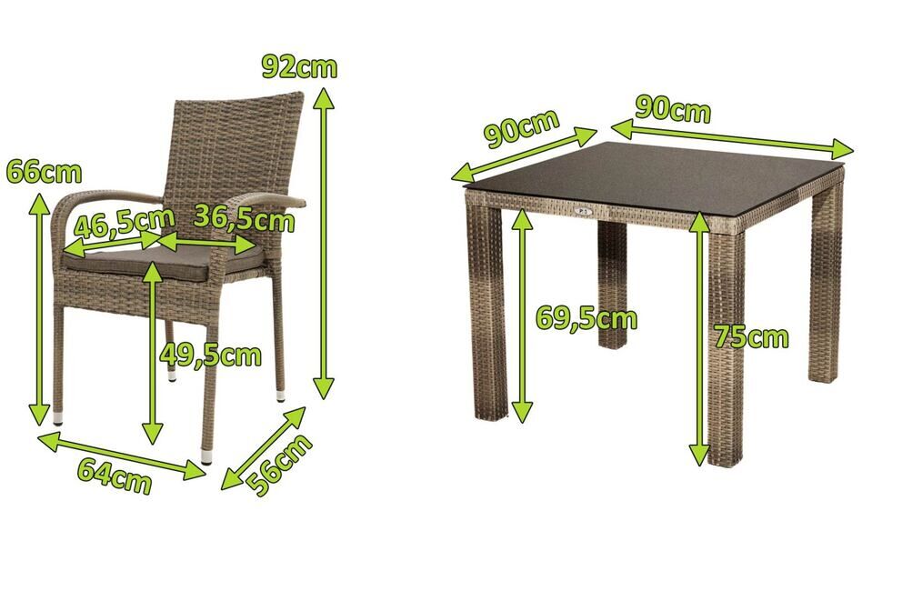 Dieses gemütliche Möbelset bietet bequem bis zu vier Personen Platz. Das Set besteht aus vier praktischen Stapelstühlen und einem Dining Tisch. Der gemütliche Stapelstuhl passt sich perfekt an Ihren Garten, die Terrasse oder den Balkon an. Der Sessel hat ein Gesamtmaß von ca. 56 x 64 x 92 cm. Die Sitzfläche ist ca. 46,5 cm tief, die Sitzhöhe mit Kissen liegt bei ca. 49,5 cm. Die Armlehnen mit einer Höhe von ca. 66 cm sorgen bei diesem Sessel für besonderen Komfort. Mit seinem Gewicht von ca. 5,5 kg lässt sich der Stuhl ganz leicht verschieben. Bei Nichtgebrauch können Sie mehrere Stühle ganz leicht aufeinanderstapeln und diese platzsparend verstauen. Der Tisch bietet dank seiner Maße von ca. 90 x 90 x 75 cm großzügig Platz für zwei bis vier Personen. Er wird mit einer ca. 8 mm starken Spraystone Platte (Glasplatte in Steinoptik) geliefert. Daraus ergibt sich eine wetter- und stoßfeste sowie pflegeleichte Oberfläche in einer eleganten Natursteinoptik, die sich mit einem milden Reiniger und einem Lappen kinderleicht pflegen lässt. Die Tischbeine haben ein Maß von ca. 8 x 8 cm, während die Unterschubhöhe des Tisches ca. 69,5 cm beträgt.