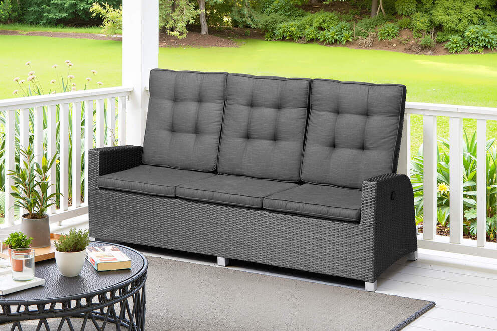 Dieses gemütliche Diningsofa ist wahrlich ein Verwandlungskünstler. Hier können Sie gemütlich mit einem guten Buch in der Sonne liegen oder aber auch, dank der Comfort-Sitzhöhe von ca. 50 cm mit Kissen, ganz bequem Ihr Mittag- oder Abendessen zu sich nehmen. Hierzu brauchen Sie einfach nur Platz zu nehmen und sich problemlos eine bequeme Liege- oder Sitzposition einstellen. Dies gelingt kinderleicht dank der integrierten Gasdruckfeder - die Rückenlehnen können einzeln mit einem kleinen Hebel an der Seite stufenlos verstellt werden. Der Hebel für die mittlere Rückenlehne befindet sich in der Sitzfläche, also einfach das Kissen anheben, dann kann man auch die mittlere Lehne verstellen. Außerdem lässt sich die Sitzfläche links und rechts jeweils 5-fach verstellen, sodass eine perfekte Liegeposition entsteht. Das Sofa hat ein Gesamtmaß von ca. 210 x 85 x 112 cm und bietet für 3 Personen ausreichend Platz. Die Sitzfläche ist ca. 54 cm tief, so kommt die Entspannung beim Hinsetzen von ganz allein. Die Armlehnen mit einer Höhe von ca. 67 cm sorgen bei diesem Sofa für besonderen Komfort.