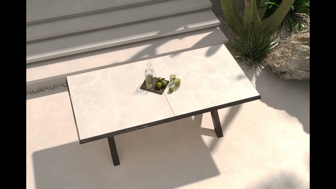 Das markante X-Gestell verleiht dem Tisch eine außergewöhnliche Stabilität und ein modernes, stilvolles Erscheinungsbild. Die Kombination aus schwarzem Gestell und grauer Keramikplatte passt perfekt zu modernen Outdoor-Bereichen und lässt sich vielseitig mit Gartenstühlen und Loungemöbeln kombinieren. |