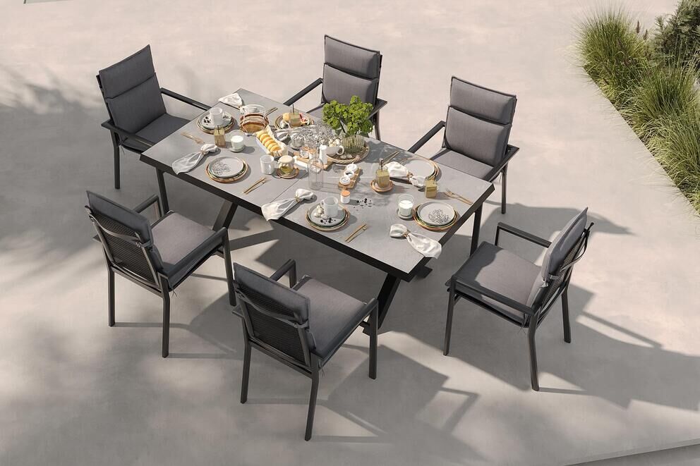 Mit der OUTFLEXX Serro Garten-Essgruppe holen Sie sich ein hochwertiges Ensemble in Ihren Außenbereich, das Design, Komfort und Funktionalität auf beeindruckende Weise vereint. Die Kombination aus einem ausziehbaren Aluminium-Steinimitattisch und sechs stapelbaren Sesseln mit passgenauen Sitzkissen schafft eine elegante Wohlfühlatmosphäre – ideal für gemütliche Familienessen, gesellige Feierabende oder sommerliche Grillabende im Freien.