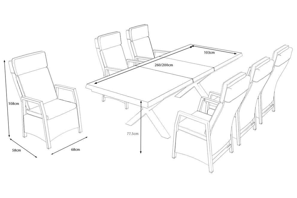 Mit einer Größe von ca. 68 x 58 x 108 cm bieten die Diningsessel komfortable Proportionen für lange, gemütliche Stunden am Tisch. Die wetterfesten Materialien Aluminium und Polyrattan sorgen dafür, dass die Sessel auch bei intensiver Nutzung und wechselnden Witterungsbedingungen formstabil bleiben. Die pflegeleichte Oberfläche lässt sich mühelos reinigen, sodass die Essgruppe stets einladend aussieht.