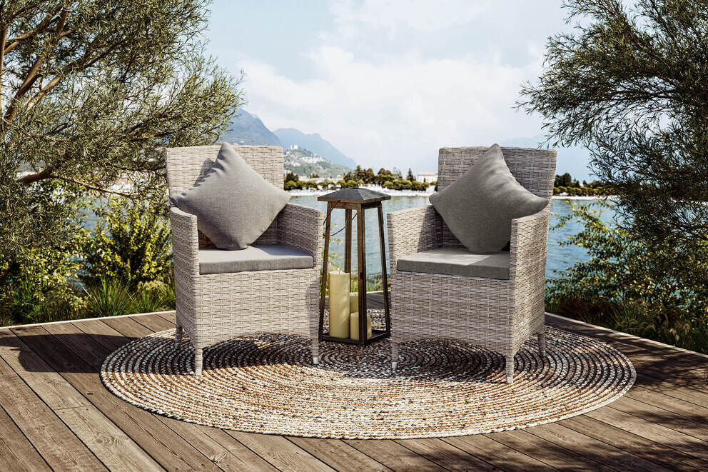 Erleben Sie die perfekte Kombination aus Funktionalität und Design: Das desert-beige Polyrattan-Geflecht wirkt edel und modern, während die hellen Kissen einen freundlichen Kontrast setzen. Durch ihre zeitlose Optik passen diese Sessel ebenso gut zu rustikalen Holztischen wie zu modernen Glas- oder Metallvarianten. Wer Wert auf Komfort, Langlebigkeit und ein harmonisches Gesamtbild legt, wird an diesem 2er Set seine pure Freude haben.
