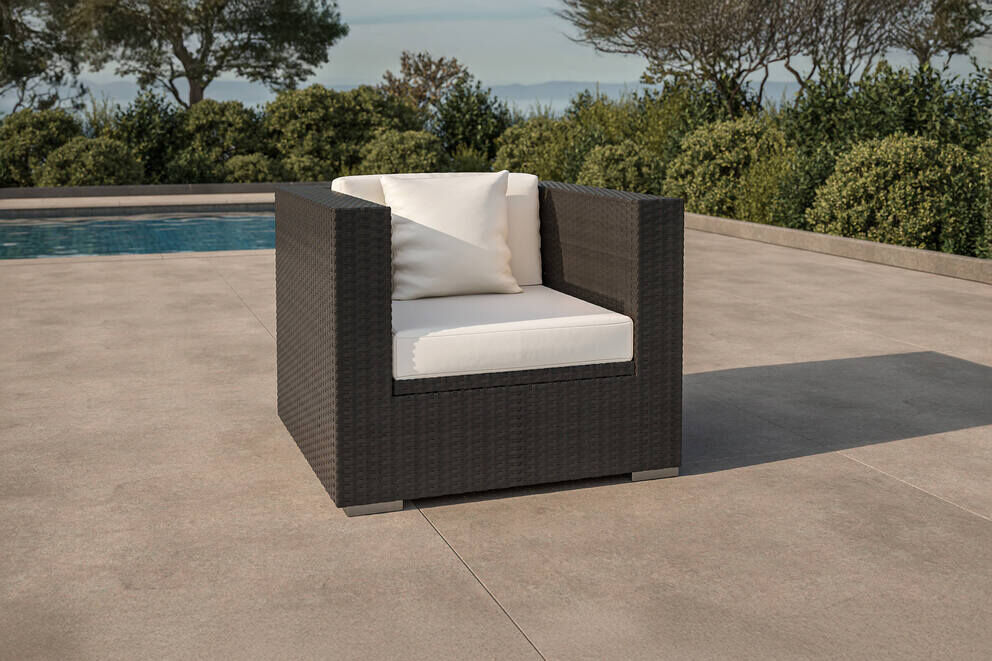 Für Ihre individuelle Gartengestaltung gibt es die ModulemelenteLine, deren einzelne Möbel alle variabel stellbar sind und sich vielfältig kombinieren lassen. Hier erhalten Sie einen OUTFLEXX® Sessel aus der schwarzen Geflechtfaser.