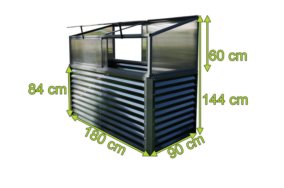 Der anthrazitfarbene Hochbeetaufsatz aus pulverbeschichtetem Aluminium und 4 mm dicken Polycarbonat Hohlkammerplatten ist durch seine Materialien und deren hochwertiger Verarbeitung extrem witterungsbeständig, stabil und robust. Er hat die Maße von ca. 176 x 86 x 60 cm, ein Gewicht von ca. 12,5 kg und verfügt über zwei separat zu öffnende Dachfenster und insgesamt vier Schiebefenster vorne und hinten , welche einen einfachen und problemlosen Zugang zu Ihren Pflanzen ermöglichen und ausreichend Belüftungsmöglichkeiten für eine optimale Sauerstoffzufuhr bieten. Das Klima im Frühbeetaufsatz unterstützt bereits kurz nach Ende der winterlichen Witterung das Wachstum frischer Kräuter und Jungpflanzen ohne Düngerzugabe. Die Gartensaison wird mit dem Frühbeetaufsatz erweitert. Es sind bis zu 3 Ernten pro Jahr im eigenen Gemüse-/Obstgarten möglich.
