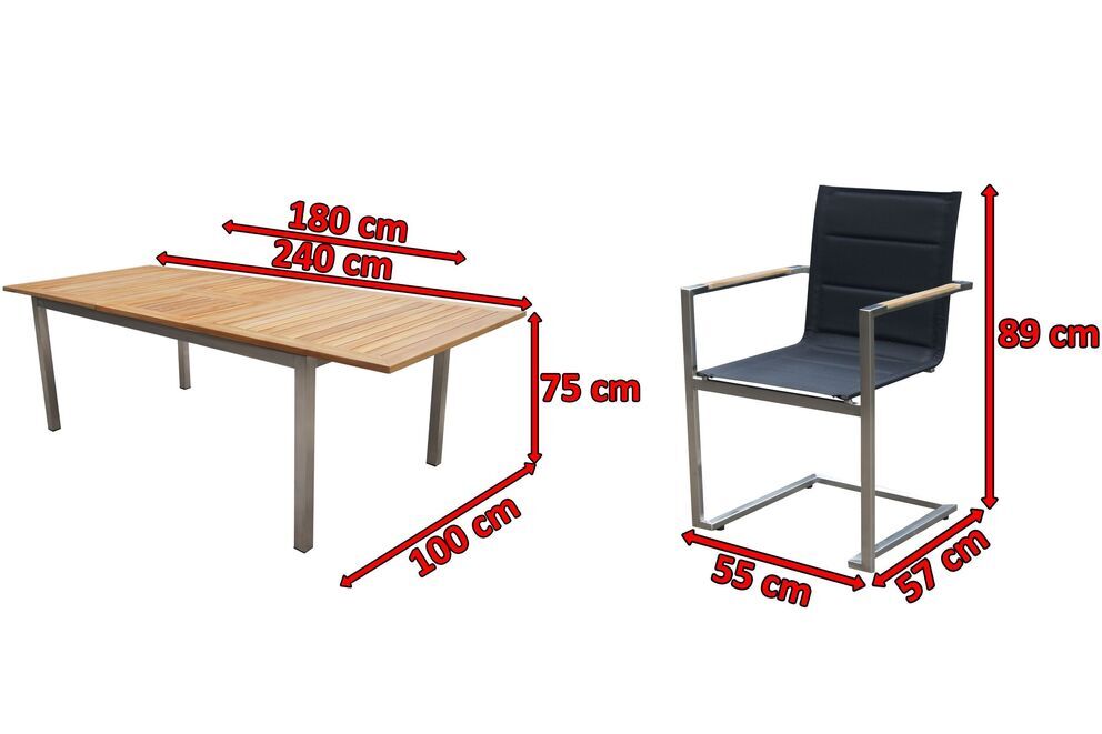 Eine flexible und sehr komfortable Esstischgruppe, welche ihrem Besitzer viele Jahre Freude bereiten wird. Die verwendeten Materialien sorgen hier für eine extrem lange Lebensdauer und machen die Gartenmöbel sowohl robust als auch sehr pflegeleicht. Das Set von OUTFLEXX® für 6 Personen besteht aus einem Ausziehtisch mit den Maßen von ca. 180/240 x 100 cm und 6 Stapelstühlen mit einer Textilenbespannung mit integrierter Polsterung in der Farbe schwarz.