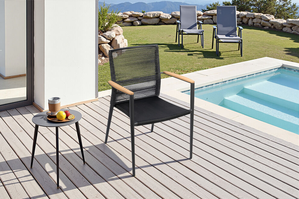 Dank der matten anthrazitfarbenen Pulverbeschichtung ist das Aluminiumgestell nicht nur rostfrei, sondern auch extrem pflegeleicht. Das Teakholz an den Armlehnen verleiht dem Sessel einen natürlichen und warmen Akzent, der sich harmonisch in jede Umgebung einfügt. Die Textilbespannung aus Rope-Geflecht in der Sitzfläche sorgt zudem für optimalen Sitzkomfort und zeichnet sich durch ihre Atmungsaktivität und Strapazierfähigkeit aus. Ob für entspannte Stunden in der Sonne oder gesellige Abende mit Freunden – dieser Stapelsessel erfüllt alle Ansprüche.