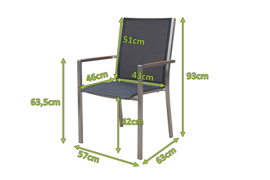 Erstklassiges Design und höchste Sitzqualität für Ihre Terrasse: der Sessel ist mit Maßen von ca. 63 x 57 x 93 cm mit bis zu ca. 150 kg belastbar und bietet Ihnen mit einer Sitzbreite von ca. 43 cm und einer Sitztiefe von ca. 46 cm auch eine großzügige Sitzfläche, die jederzeit zum Verweilen einlädt. Das Gestell besteht aus gebürstetem Edelstahl der Güteklasse 304 im natürlichen Silberton, während die hautschmeichelnden Armlehnen – aus natürlichem Teakholz – erhöhten Komfort schenken. Die Kombination aus dem modern und glänzend gestalteten Gestell und den natürlichen, warmen Armlehnen schenkt dem Sessel sein exklusives und stilvolles Aussehen, das sich harmonisch in Ihre Gartengestaltung integriert. Für die Bespannung des Gestells findet Textilene (30% Polyester und 70% Vinyl) im passenden Schwarzton Verwendung. Das Material ist unglaublich sorgt für ein herrlich luftiges Sitzgefühl, das Sie auch in der Sommerhitze nicht im Stich lässt. Dank des schlanken Designs und geringen Gewichtes von ca. 6,48 kg lässt sich der Sessel auch leicht transportieren, stapeln und platzsparend verstauen.