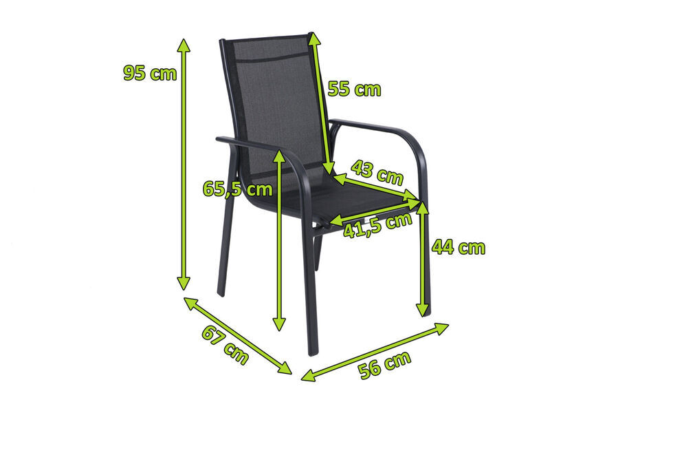 Dieser Stapelstuhl verfügt über ein pulverbeschichtetes Aluminiumgestell, welches die exklusive Farbe OUTFLEXX® anthrazit matt trägt. Aluminium ist ein gern und oft verwendetes Material beim Bau von Gartenmöbeln, da es eine hohe Stabilität und Langlebigkeit aufweist. Zudem ist es ein leichtes Material, besitzt eine gute Korrosionsbeständigkeit und ist witterungsbeständig. Die Pulverbeschichtung verbessert zusätzlich die Stoß-, Schlag- und Kratzfestigkeit des Materials und verleiht dem Aluminium einen dauerhaften Korrosionsschutz und eine anhaltende Korrosionsbeständigkeit. Der Stuhl hat ein Gesamtmaß von ca. 67 x 56 x 95 cm und ein Gewicht von ca. 2,8 kg, wodurch sich das Leichtgewicht ohne größere Anstrengungen an einen anderen Platz transportieren lässt. Bei Nichtgebrauch kann der Stuhl mit modellgleichen Stühlen gestapelt und platzsparend verstaut werden. Mit einer Belastbarkeit von bis zu ca. 130 kg ist der stabile Sessel robust und für erholsame Stunden in der Sonne einsatzbereit.