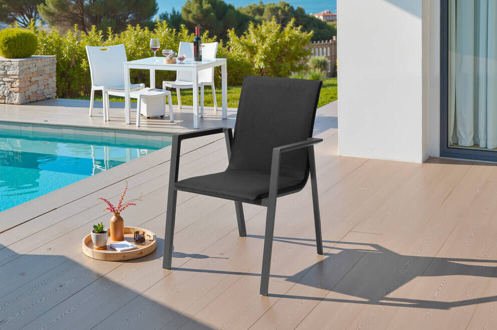 Gefertigt aus robustem Aluminium und wetterbeständigem Textilene bietet der Stapelstuhl eine ideale Kombination aus Stabilität und Komfort. Die pulverbeschichtete Oberfläche des Aluminiumrahmens sorgt nicht nur für ein elegantes Finish in Schwarz, sondern schützt das Material auch vor Korrosion und Witterungseinflüssen. Das Textilene-Material der Sitzfläche und Rückenlehne ist schnelltrocknend und pflegeleicht, sodass der Stuhl auch nach einem Regenschauer schnell wieder einsatzbereit ist.