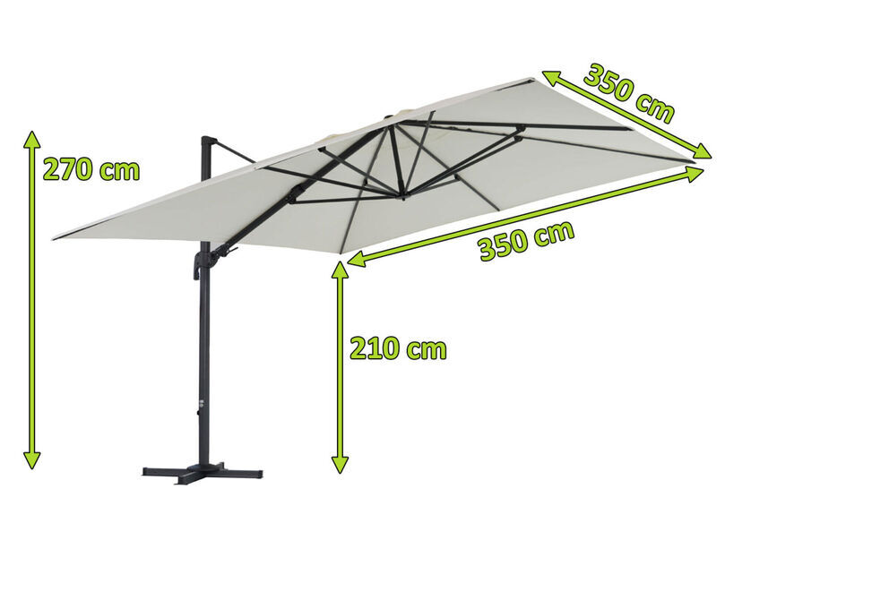 Der quadratische Sonnenschirm von OUTFLEXX® besticht durch seine hochwertig verarbeiteten Materialien und seine praktischen Funktionen. Das ca. 350 x 350 cm große Schirmtuch besteht aus 100% Polyester (ca. 250 g/m²). Zusätzlich ist das cremefarbene Schirmtuch wasserabweisend imprägniert. Das Gestell besteht aus pulverbeschichtetem Aluminium in anthrazit und hat dabei eine Haupt-Rohrdicke von ca. 65 x 95 mm. Der Ampelschirm besitzt keinen Mittelmast und bietet daher eine praktische Lösung, um ohne Probleme eine komplette Sitzgruppe zu beschatten. Die großzügige Durchgangshöhe von ca. 210 cm schränkt die Nutzung Ihrer Terrasse in keinster Weise ein. Durch einen hohen UV-Schutz von 80+ spendet der Sonnenschirm dabei extra viel Schatten. Die Beschattung bei unterschiedlicher Sonneneinstrahlung ist mit diesem praktischen Ampelschirm problemlos möglich, da das Schirmtuch entlang des Standrohres und des Stützbalkens geneigt werden kann. Zudem lässt sich der Schirm durch den leichtgängigen Kurbelmechanismus kinderleicht aufspannen. Diese Kurbel können Sie in den unteren Teil des Schirmstocks umstecken und so den Schirm um 360° drehen. Weiterhin ist der schirm seitlich neigbar. Das integrierte Air-Vent System lässt auch bei sehr warmen Klima die Luft unter dem Schirmtuch zirkulieren. Die 8 eingebauten Dachstreben mit den Maßen von ca. 17 x 25 mm sorgen zusätzlich für weitere Standfestigkeit. Im Lieferumfang ist ein Plattenständer für Wegplatten enthalten. Um einen sicheren Stand zu gewährleisten, empfehlen wir Ihnen den ca. 29 kg schweren Ampelschirm mit ca. 100 kg Wegplatten zu beschweren. Bitte beachten Sie, dass die Platten NICHT mit im Lieferumfang enthalten sind.