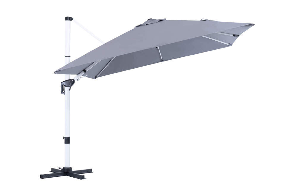 Mit seinem quadratischen Design und der eleganten weißen Farbe fügt sich der Ampelschirm harmonisch in jede Außenumgebung ein und verleiht Ihrem Garten oder Ihrer Terrasse eine stilvolle Note. |