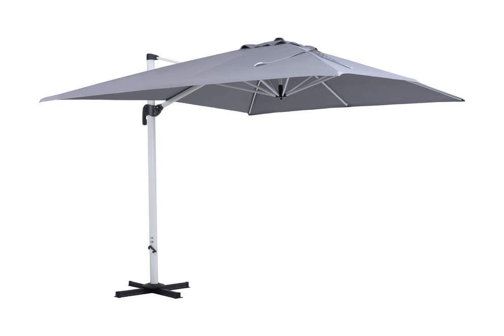 Das pulverbeschichtete Aluminiumgestell und das UV-beständige Polyester-Schirmtuch in grau garantieren eine lange Lebensdauer und höchste Witterungsbeständigkeit. |