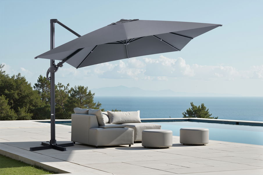 Die quadratische Form und das moderne, graue Design machen diesen Schirm zu einem optischen Highlight, das sich harmonisch in jede Gartengestaltung einfügt. Seine schmutzabweisenden und pflegeleichten Materialien erleichtern die Reinigung und sorgen dafür, dass der Schirm auch nach längerer Nutzung wie neu aussieht. Ob für ein gemütliches Frühstück im Freien oder als Schutz vor intensiver Mittagssonne – dieser Ampelschirm vereint Funktionalität und Ästhetik auf höchstem Niveau.