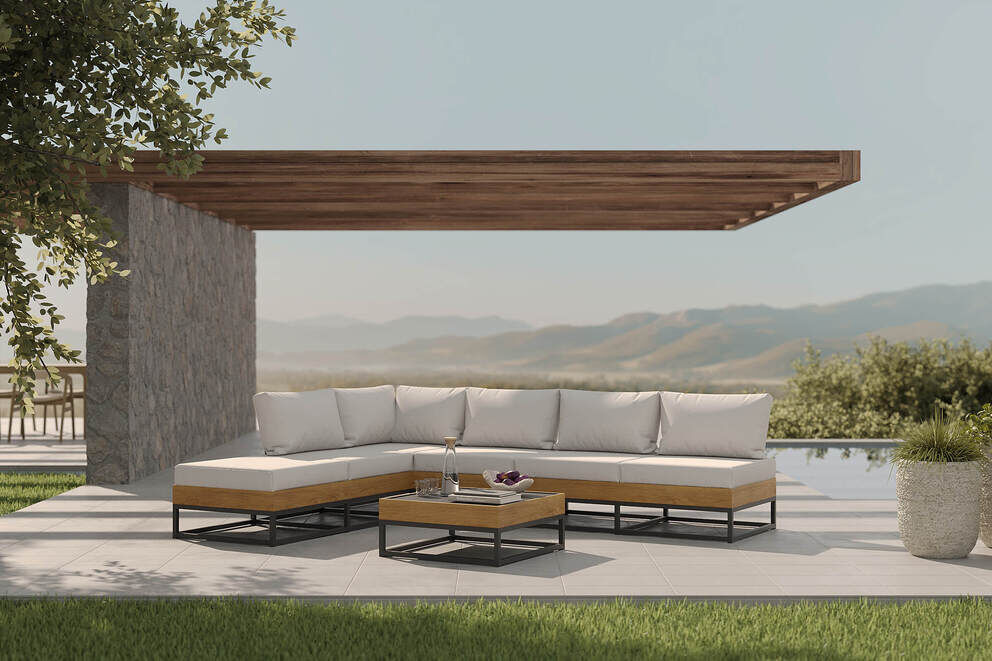 Die OUTFLEXX Taro Gartenlounge vereint modernes Design, hohen Sitzkomfort und eine klare Formensprache zu einem harmonischen Ensemble für Garten, Terrasse oder Lounge-Bereich im Freien. Die Kombination aus anthrazitfarbenem Aluminiumgestell, dekorativen Elementen in Holzoptik und hellen Polstern verleiht der Gartenlounge eine zeitlos elegante Ausstrahlung, die sich mühelos in unterschiedliche Outdoor-Konzepte einfügt.