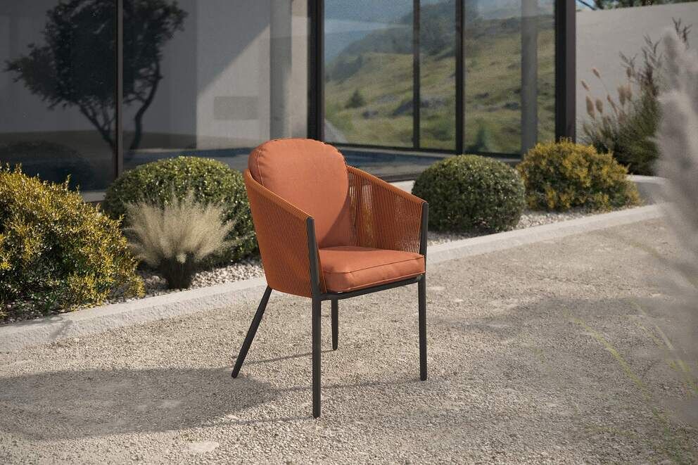 Der Dining Sessel überzeugt mit einer eleganten Kombination aus anthrazitfarbenem Aluminium und orangefarbenem Rope-Geflecht. Seine Formgebung fügt sich harmonisch in moderne Terrassen- und Gartenlandschaften ein und setzt dabei ein warmes, stilvolles Highlight. |