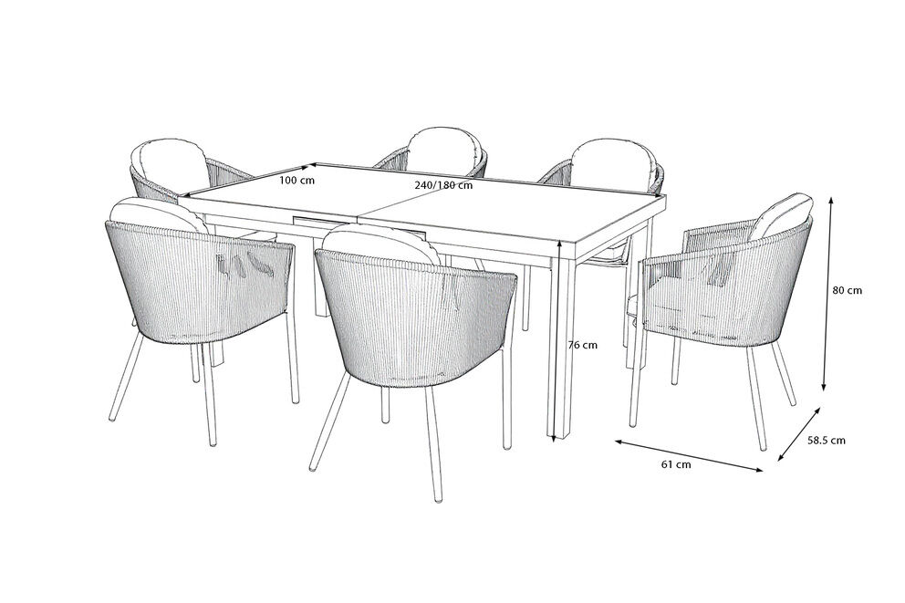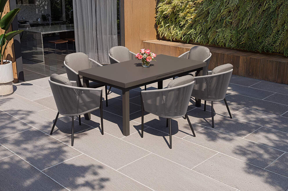 Die sechs Tavio Dining-Sessel runden die Essgruppe durch ihr harmonisches Design und ihren hohen Sitzkomfort ideal ab. Das dunkelgraue Rope-Geflecht sorgt nicht nur für ein modernes Erscheinungsbild, sondern ist zudem luftdurchlässig und besonders angenehm bei warmen Temperaturen. Die ergonomisch geformte Rückenlehne und die im Lieferumfang enthaltenen ca. 5 cm starken Sitzkissen mit abnehmbaren, waschbaren Polyesterbezügen bieten einen hervorragenden Komfort – perfekt für lange Sommerabende. Das leichte, pulverbeschichtete Aluminiumgestell macht jeden Stuhl stabil und gleichzeitig angenehm leicht zu bewegen.