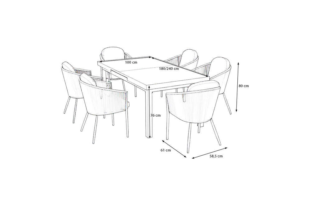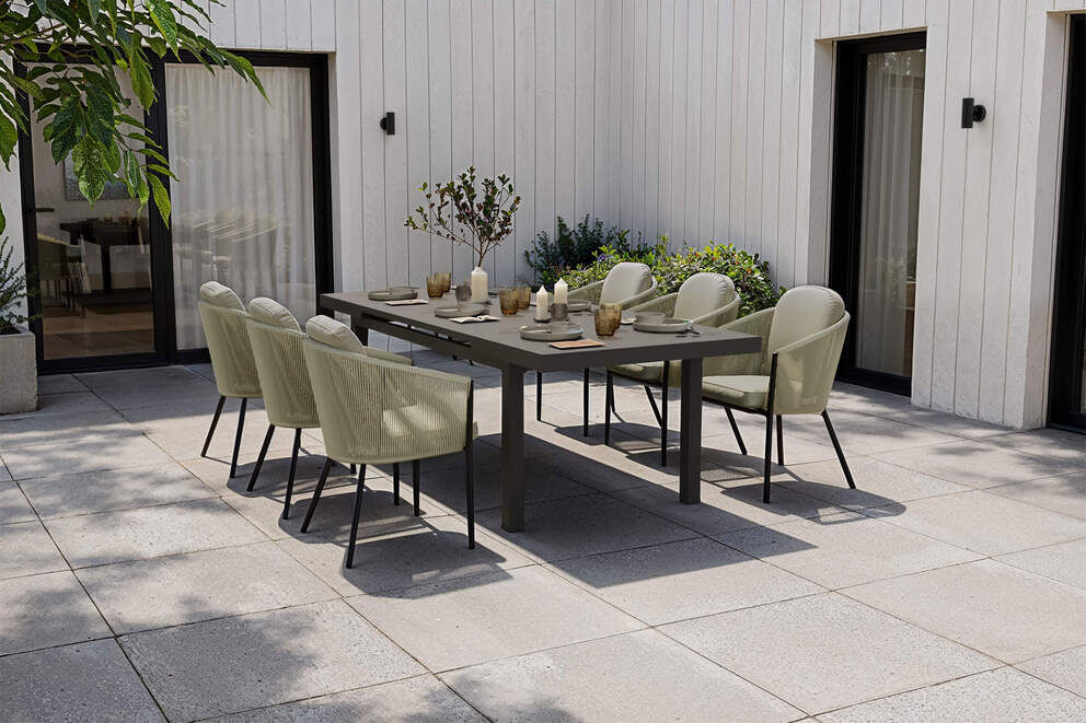 Die sechs beigefügten Dining Sessel der Serie Tavio bieten ein komfortables Sitzgefühl und eine moderne Optik. Das seitliche Rope-Geflecht ist angenehm flexibel und sorgt für eine leichte, luftige Anmutung. Die Sessel sind mit einem pulverbeschichteten Aluminiumgestell ausgestattet, das farblich optimal zum Tisch passt. Die grünen Sitz- und Rückenkissen mit abnehmbaren Bezügen integrieren sich elegant in das Gesamtbild. Jede Polsterung besitzt eine Stärke von ca. 5 cm und besteht aus widerstandsfähigem Polyestergewebe mit Schaumstofffüllung – ideal für lange Sommerabende im Freien. Da die Sessel sehr leicht sind, können sie bei Bedarf platzsparend verstaut werden.
