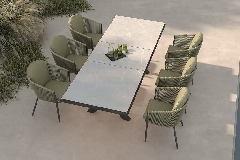Die sechs Tavio Dining Sessel ergänzen den Tisch perfekt. Ihr anthrazitfarbenes Aluminiumgestell wird durch seitliche Elemente aus Rope-Geflecht ergänzt, das dem Design eine besondere Leichtigkeit verleiht und gleichzeitig angenehm flexiblen Sitzkomfort bietet. Die Polster in dezentem Grün schaffen wohnliche Akzente und sind mit abnehmbaren Bezügen ausgestattet, die unkompliziert gereinigt werden können. Mit einem Gewicht von nur ca. 4,2 kg pro Sessel lassen sie sich mühelos bewegen und aufgrund ihrer Leichtigkeit platzsparend verstauen.