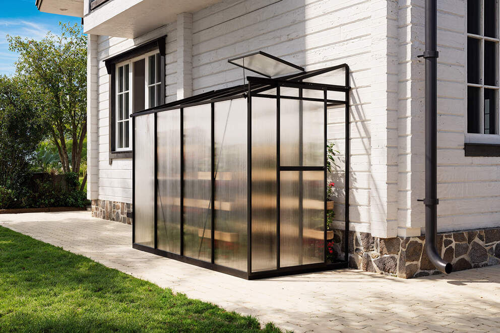 Ein weiterer Vorteil dieses Modells ist seine durchdachte Belüftung und einfache Handhabung. Das OUTFLEXX Verde Comfort ist mit einer leichtgängigen Schiebetür ausgestattet, die einen bequemen Zugang ermöglicht und gleichzeitig für eine natürliche Luftzirkulation sorgt. Zusätzlich kann ein integriertes Fenster geöffnet werden, um Temperatur und Feuchtigkeit gezielt zu regulieren – so schaffen Sie jederzeit das perfekte Klima für Ihre Pflanzen.